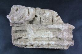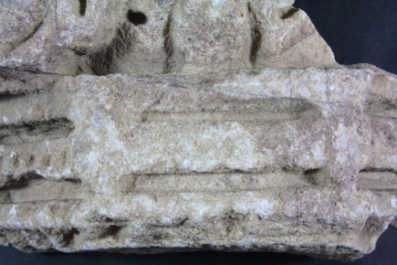 Architectural member made of stone, Color is brownish. Deep lines, leaf design, incise lines on it and all sides are broken. Deposition of dust and dirt. Rubbing on the surface and flaking on it.