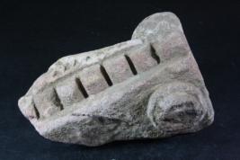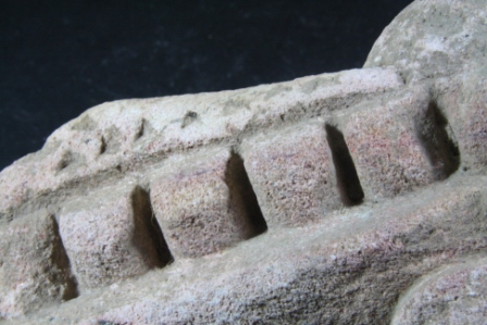 Fragment of ceiling made of stone, Color is brownish. It is decorated and design is clearly visible. All sides are broken. Deposition of dust and dirt. Rubbing on the surface and flaking on it.