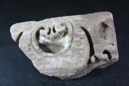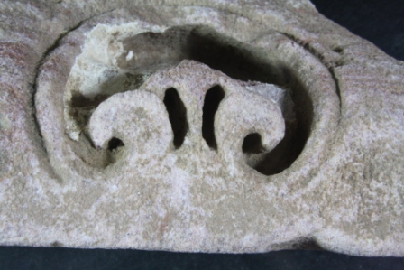 Fragment of architectural member made of stone, Color is brownish. It is well decorated and design is clearly visible. All sides are broken. Deposition of dust and dirt. Rubbing on the surface and flaking on it.