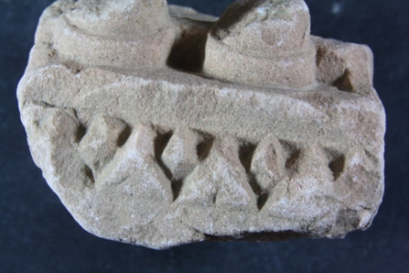 Fragment of architectural member made of stone, Color is brownish. It is well decorated and design is clearly visible. All sides are broken. Deposition of dust and dirt. Rubbing on the surface and flaking on it.