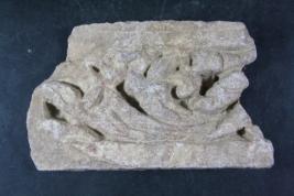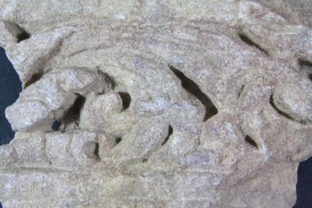 Fragment of pillar made of stone, Color is brownish. It is well decorated with floral design is clearly visible. All sides are broken. Deposition of dust and dirt. Rubbing on the surface and flaking on it.