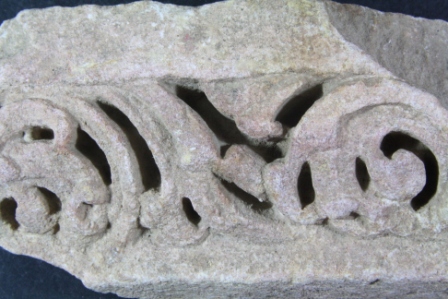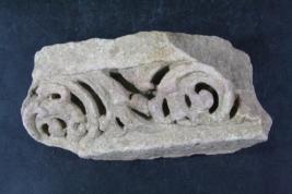 Fragment of pillar made of stone, Color is brownish. It is decorated with floral design is clearly visible. All sides are broken. Deposition of dust and dirt. Rubbing on the surface and flaking on it.