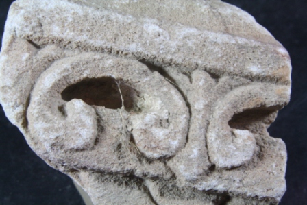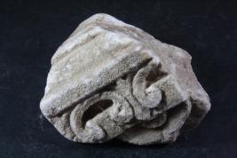 Fragment of pillar made of stone, Color is brownish. A lotus design with leaf and some on it. All sides are broken. Deposition of dust and dirt. Rubbing on the surface and flaking on it.
