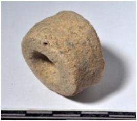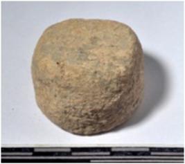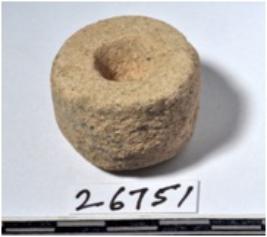 | Description / विवरण | A stone door jam with flat base having depression in the centre of rough surface. |
