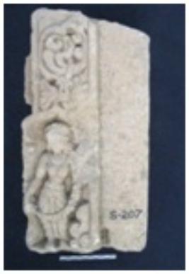 | Description / विवरण | fragment of vedibandhas, curving of a standing female figurine is holds Vanmala with both hands. |