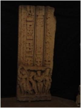 | Description / विवरण | Doorjamb showing Yamuna followed by a chhatra holder, a garland holder and a male attendant. A miniature figure is shown between chhatra holder and the river goddess. Above this naga, mithuna stambha and bahya shakhas are shown. All the figures are weathered and mutilated. |