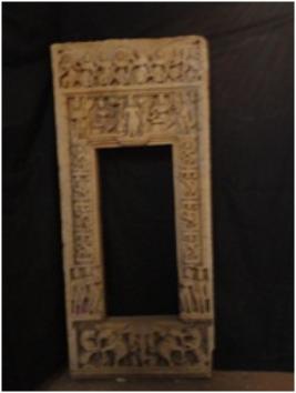 | Description / विवरण | Complete door of a miniature temple showing audumber in the centre of the doorsil, flanked by an elephant and a lion on either side. On doorjamb male and female in standing posture are shown while above them Naga, Gandhava and bahya shakhas are shown. Above at the lintel part standing Vishnu in centre flanked by two kneeling devotees on either side are shown. He is flanked by Laxmi and sarswati on right and left respectively on both the ends, a male in standing posture is shown. Above this saptamatrikas with Ganesh are shown |