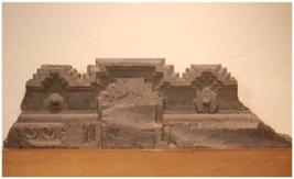 | Description / विवरण | An architectural fragment. Probably part of the lintel of a religious structure Hindu or Buddhist with intricately carved chaitya arch motifs. Floral motifs are carved on the panels below the arch. The central arch has a heavy pro- jecting relief with stellar decoration |