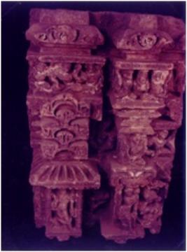 | Description / विवरण | Architectural member of a temple s shikhar. Showing figures in three registers. Upper register has five vidhyadharas in flying posture, middle register shows a chaityamesh design, a male deity in seated posture holding a mace and water vassel in his right and left hands respectively, a vidhyadhara and a musician, lower register shows Agni, Indra standing in tribhangamudra within the pilastered niche. An Apsara standing in tribhanamudra holding a gada in her left hand while her right hand is suspanded below encircled with a scarf. On her either side is a vyal. |