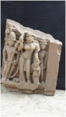 | Description / विवरण | Architectural Fragment, lower part of doorjamb showing a female deity in standing posture wearing karandmukuta, kundlas and necklaces. She holds a kalash in her right hand while her left hand is suspended below and is kept over the head of a miniature female standing to her left. She is flanked by a male on either side. Her right side s male figure holds a danda in his hands. Above whom traces of nagadevata are visible. A lion is shown in lower part to the right of female deity. Face and breasts of the female deity are broken. |