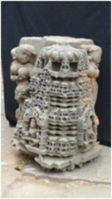 | Description / विवरण | Architectural Fragment, shikhar part of a miniature temple showing a seated male in lalitasana within a small niche on two of its sides. The whole shikhar design is flanked by a standing female figures on either side which are damaged. |