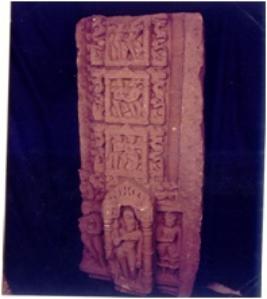 | Description / विवरण | Architectural member of a Shaiva temple, doorjamb, showing Ganga in standing posture within the pilastered niche surmounted with the makartoran. She holds a lotus flower in her Rt. hand while the Lt. hand is suspended below. She wears usual ornaments. To the right of niche is a female attendant standing in tribhangamudra holding a kalasa. Near her legs is a crocodile. To the left of niche is a male deity wearing karand mukuta with his Lt. hand is in updesh mudra. Shaft part of the doorjamb shows patrasakha, nagasakha, Vyal sakha, Mithunsakha, Vyal sakha and bahyasakha. These sakhas are supported by kichakas in lower portion at the extreme end of kichaka are nag and two traders on another side. figure are weathered and partially mutilated. |