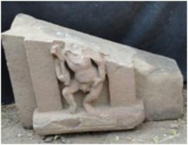 | Description / विवरण | Architectural fragment showing a male in dancing pose within a plastered niche.His left hand is kept on his thigh while in his right hand he holds some danda like weapon. His right leg is damaged. He wears a necklace and his genital organ is very prominent. |