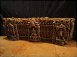 | Description / विवरण | Doorlintel, a seated tirthankar flanked by a male Chauribearer is shown in the centre on a lion pedestal which is also flanked by a seated male and female to its right and left respectively. On both the sides of these figures, Navagrihas are shown 4 on right and 5 on left side. After these Navagrihas, on both the end, a standing tirhankar is shown within the pilastered niche. This is also flanked by a male chauribearer on either side. Above these navagrihas, in upper register, saptamatrikas are shown which is flanked by a vidyadhar holding a garland on either side. All the figures are mutilated weathred and their facial features are also worn Out. |