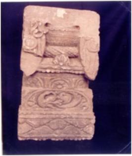 | Description / विवरण | Architectural fragment, lower part of a pillar showing pot and foliage design and a peacock with pot & foliage. |