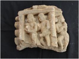 | Description / विवरण | Architectural fragment showing mithuna pattika. A male and a female figure are shown in a pilastered niche. Out of the pilaster to its left a standing male is shown holding a sankh while towards its right nagashakha is shown. |