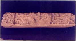 | Description / विवरण | Architectural member, lintel showing umamaheshwar in lalitasana in the middle flanked by two devotees on either side. On the dexter side is a four armed deity Brahmani flanked by two devotees and an amrous couple on extreme end. On the sinister side is Laxmi seated in padmasana flanked by two devotees and an amorous couple at the extreme end. |