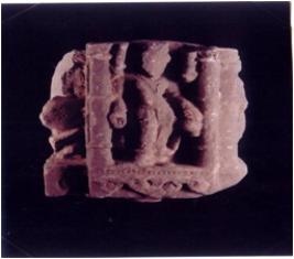 | Description / विवरण | Architectural fragment showing a four armed standing male deity holding a kamandalu with his lower left hand and a akshyamala with his lower right hand within a pilastered niche. To the left side of the block is a standing two-armed male figurine. To the right side of the block portion of a vyal figuine is traceable. Dafaced and Damaged. |