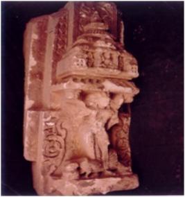 | Description / विवरण | Architectural fragment doorjamb, showing three headed kartikeya riding on peacock in the lower portion & shikhar of the tample in the upper portion with a female deity in seated posture within the niche. Figures are badly weathered & mutilated. |