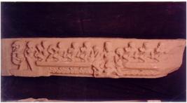 | Description / विवरण | Architectural member Lintel showing four armed Vishnu riding on Garuda he holds his icons Sankh, Chakra, Gada and Padma in all his four hands. On his either side are Navagrihas, Rahu and ketu are missing because of broken lintel. On dexter side a female is wearing sari, next to her is a Vyal. |