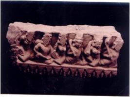 | Description / विवरण | Architectural part showing a freize of three couples of flying Vidhyadharas. Defaced and broken. |