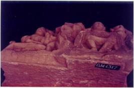 | Description / विवरण | Architectural member of a temple showing a panel of sculptures. On dexter side four armed Siva is seated in yogasan. He is holding a lotus in his upper hand while his upper right hand is broken. He is flanked by two attendants on either side with folded hands. Dexter side attendant is totally missing- leaving only the remanant of his legs. On sinister side a royal person is seated with four attendants in standing posture, two each on either side. Attendants on either ends are broken. |