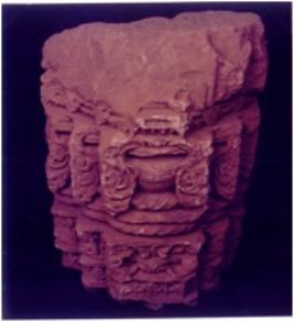 | Description / विवरण | Architectural fragment, pillar part, richly decorated with pot & foliage placed on rope cushion and kirtimukhas atternating with flying male and female vidhyadharas. |