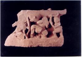 | Description / विवरण | Architectural part showing a freige depicting a six-handed figure with a sickle like weapon attacking two men. Defaced and damaged. |