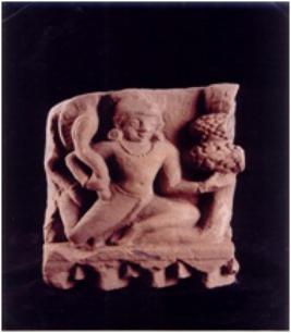 | Description / विवरण | Architectural fragment showing a flying male figure-holding mountain like object in his left hand and a club in his right hand. Decorated on bottom part Defaced and broken. |