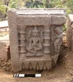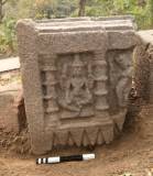 | Description / विवरण | The four armed female deity is depicted in lalitasana attitude. The seated figure of the deity is set within a plastered niche. She wears a kiritamukuta and the upper two hands hold lotuses . On the either side of the deity is seen one female attendant in tribhanga attitude. Her left side is partly broken. She also wears a short mukuta and her right hand holding some indistinct object. The lower part of the block is decorated with triangular design |