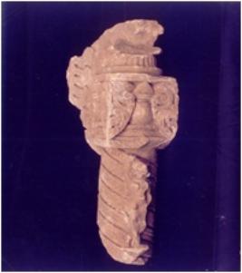 | Description / विवरण | Architectural fragment, part of a pilaster, shaft and upper portion of a pilaster decorated with spiral bands, a female dancer disrobing her drapery and pot and foliage. The female dancer is badly mutilated. |