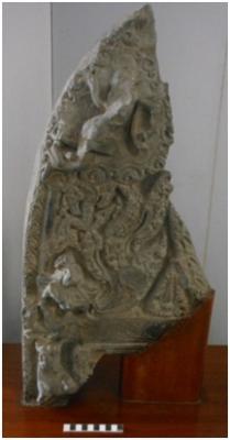 | Description / विवरण | Fragmentary upper right post of a Stella depicting Gajatorana, lion, Apsara motifs, beautifully carved. |