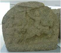 | Description / विवरण | A memorial stone depicting the hero riding over a horse holding a long spear like object in his uplifted right hand. Behind the horse are two male figures. The man at the front is holding an umbrella over the head of the hero. |