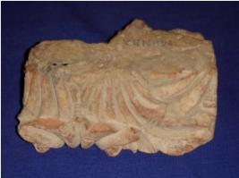 | Description / विवरण | Fragment of terracotta brick having some embossed creeper designs on one side. |