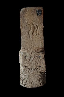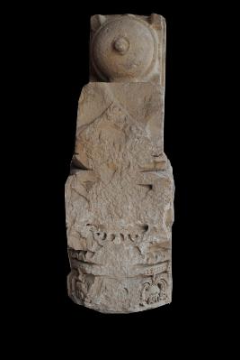Its is a architecture member or a fragment of a piller. Its bottom part three side are decorated with inside incised design and flower motifs. Its upper side has engraved a round shaped symble. Its back side is flate. Its is damaged from botom side. Surface is rough and flaked.