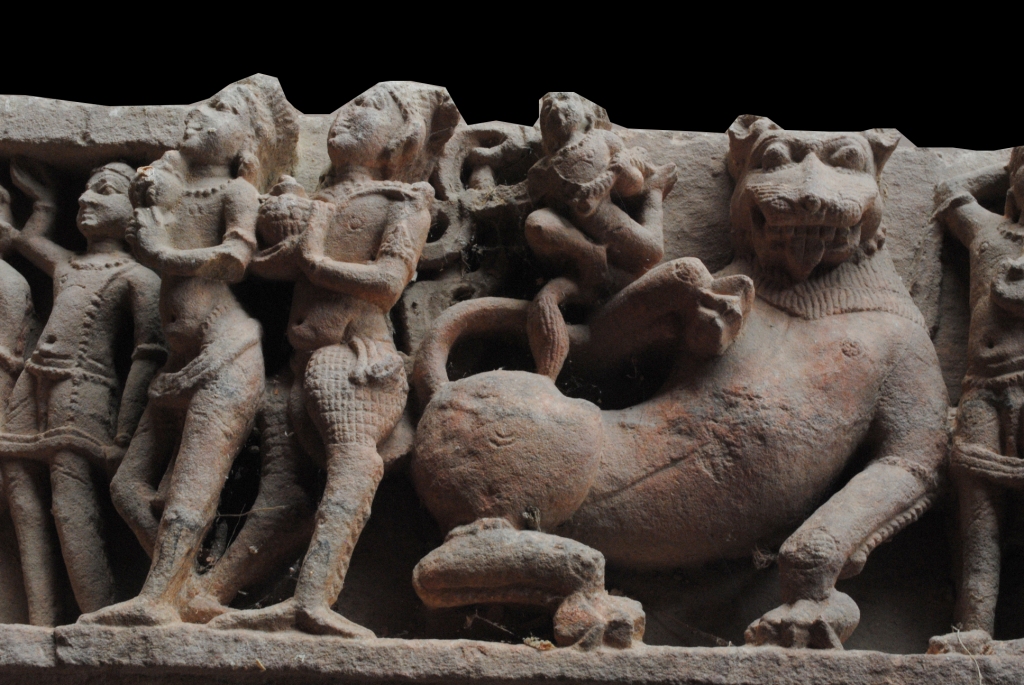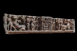 It is is a architecture member. Its front side engraved with male and female deites and lion. Some of them standing in tribanga style. A female deity sited on palestal his left and right side male and female holding kalasha and flower. It has to lion sculpture on the both corners on it. It damaged from left side.