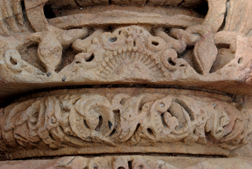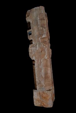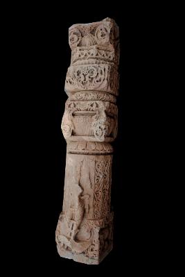 It is a piller of a temple made of sand stone. Its upper part is decorated with flower motif. The middle part on one side has engraved male deity ,who holding a weapon, other side have chain design on it. The bottom part of it is also decorated with floral pettern.