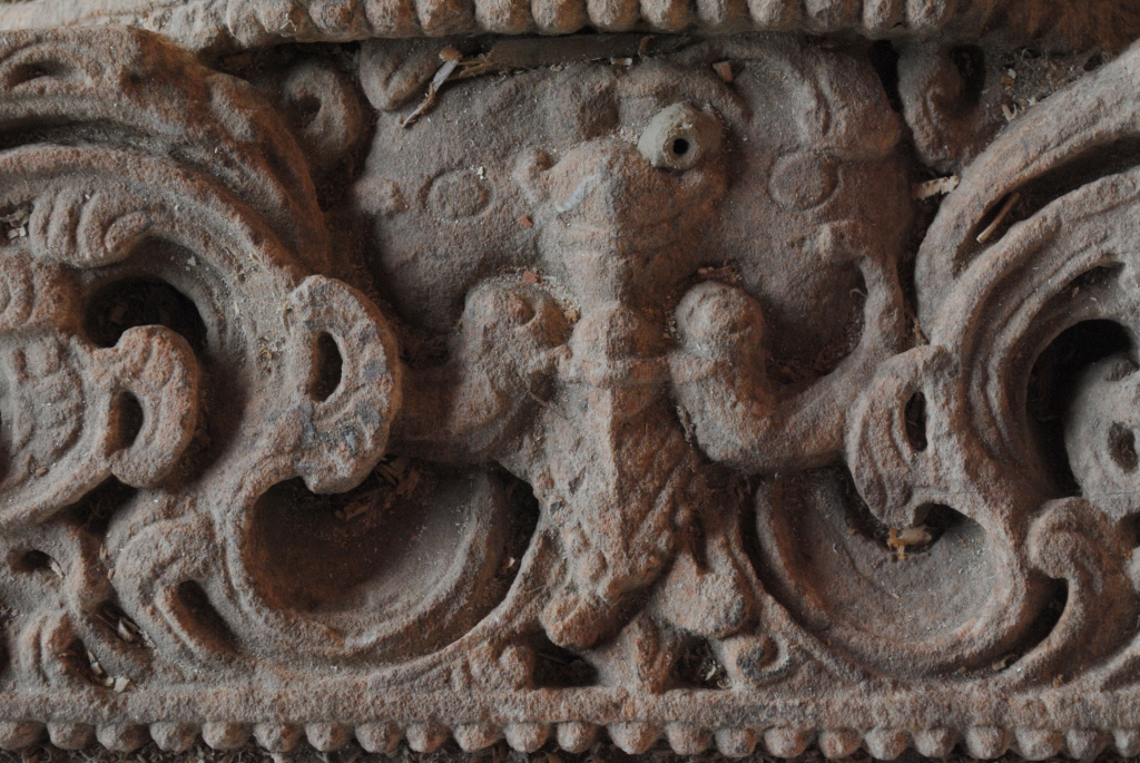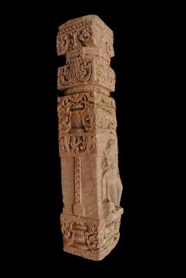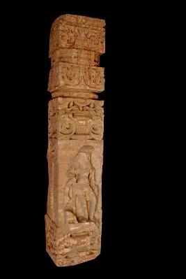 It is a pillar of temple made of sand stone. Its upper part is fine decoration with flower motif. The middle part on one side has enguraued male deity, who holding a weapon, other side have at it is also decorated with floral pettern.
