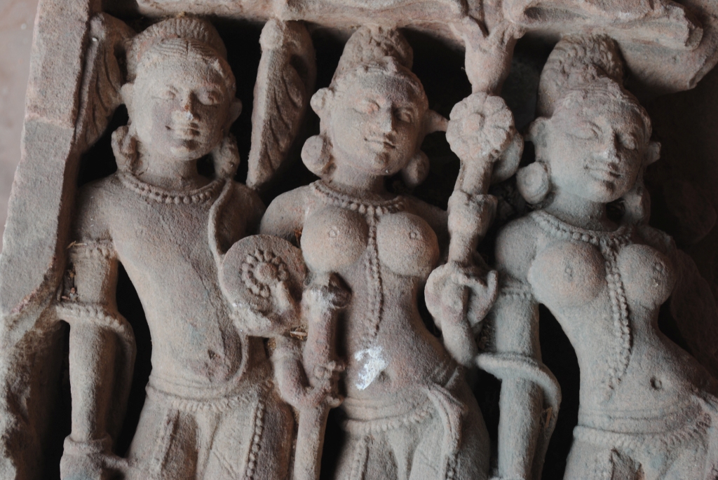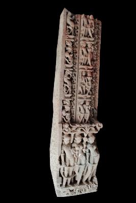 It is a door jamb made of sand stone. It may be used as a frame of the door. It has two decorated part. The bottom two female and one men are standing in tribanga style. The upper side dancing couple engraved with parallel shape. The left side of it same lion figurine are decorated. the bottom side female are holding a flower bunch.