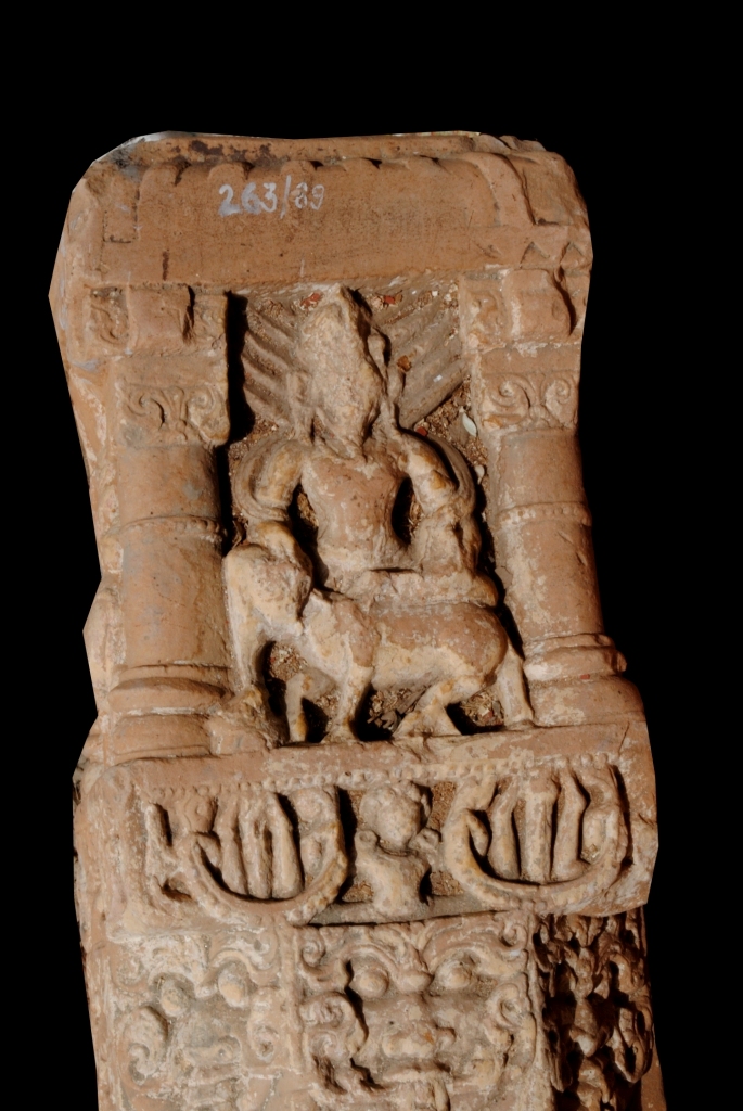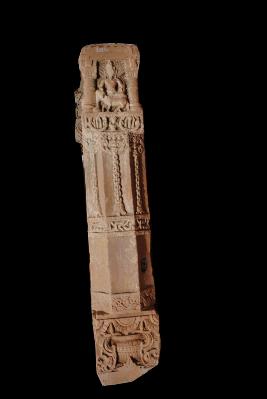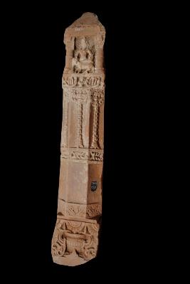 It is a pillar made of sand stone. Its upper side has four figure of good indera, he is sited on myth vehicle elephant . The middle part is decorated with the bell chain design. The bottom side has a floral motif of it.