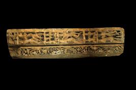 | Description / विवरण | This is a part of door frame made of sand stone. It has six attendant couple on it and all attendant faces are damaged. Three couple are sited while other is in standing position. It has a flower motif on left side. It may be used for the decoration of the door. |