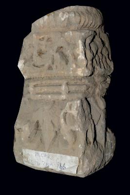 This is a part of pillar made of sand stone. Its three sides are decorated but one in plane. There are some flower motif and other incised design on its surface. It may be used for built structure.