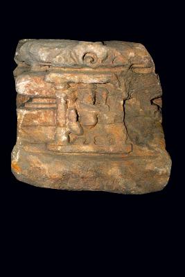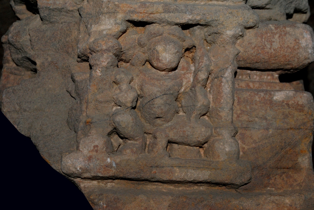 This is a sculpture of deity on plinth made of sand stone. It has four figure of sited male deity, who has holding a weapon in left hand while other hand holding Kalasha. It is wearing crown and jojapavita. The plinth is broken from two side. It has big pit on upperside. Surface is rough and flaked.