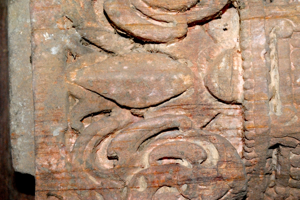 This is a part pillar made of sand stone. It may be used for build structure and decration. It has some flower motif, incised and geometrical design on it. It damaged from upper side.