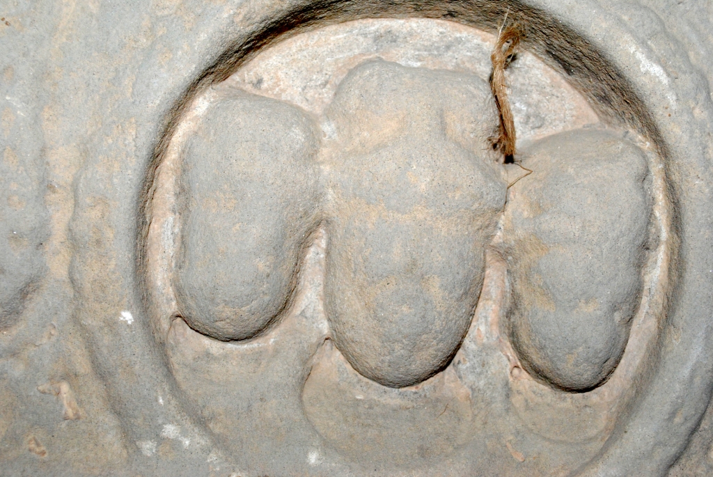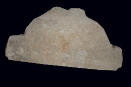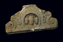 It is a sculpture of armlet part made o f sand stone. It may be used for decoration ample or sculpure. It has three head on the centre a circular dotted border on these head.There are some flower motif on its front side. Deposition of dust and dirt.
