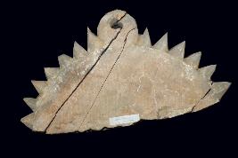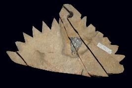 | Description / विवरण | It is a sculpture of Vyala made of sand stone. It may used for decoration or other purpose. It has arrow shaped design on the margin. There is a fine hole through it. It has some cut line on it. |