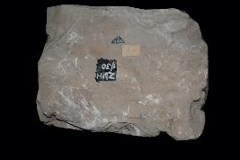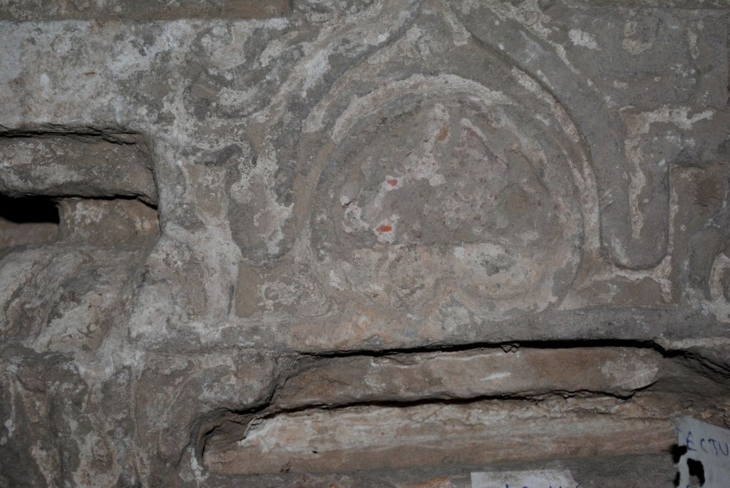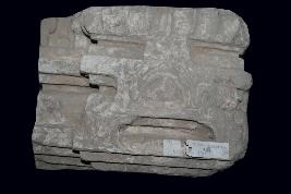 It is a architecture member made of stone. It may be used for making structure or decoration. It has a flower motif on it. There are some incised design on its surface. It has some white ship coverd it.