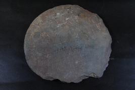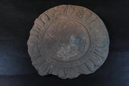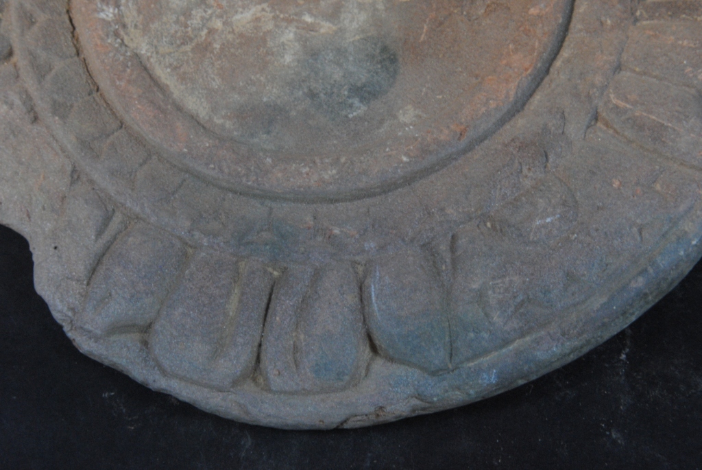It is a Lotus flower made of sand stone. It has some floral pattern on it. It may be used for as a decoration or other purpose. It has incised circular design. Deposition of dust and dirt. Surface is rough and flaked.