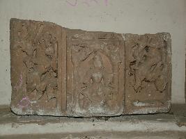 | Description / विवरण | This Fragment of Architectural member is having three carved section. Middle one section is having one defaced deity in seated posture. Rest two sections are having figures of Vyalas mythological animal with human figures in it. Carved floral designs can be seen to some extent. |
