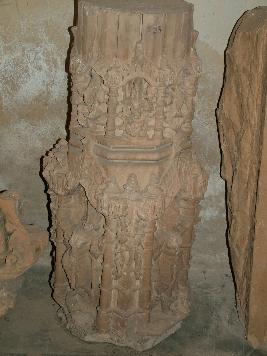 | Description / विवरण | It is a Fragment of Architectural member part of a pillar which is carved with male and female designs. At the lower part it has four female deities of four handed, they are all in tribhanga posture and carved in separate niches All are defaced and broken . At the top of it there is deity, in Lalitasan posture, carved in separate niches. Above it there are 16 vertical wide ridges. |